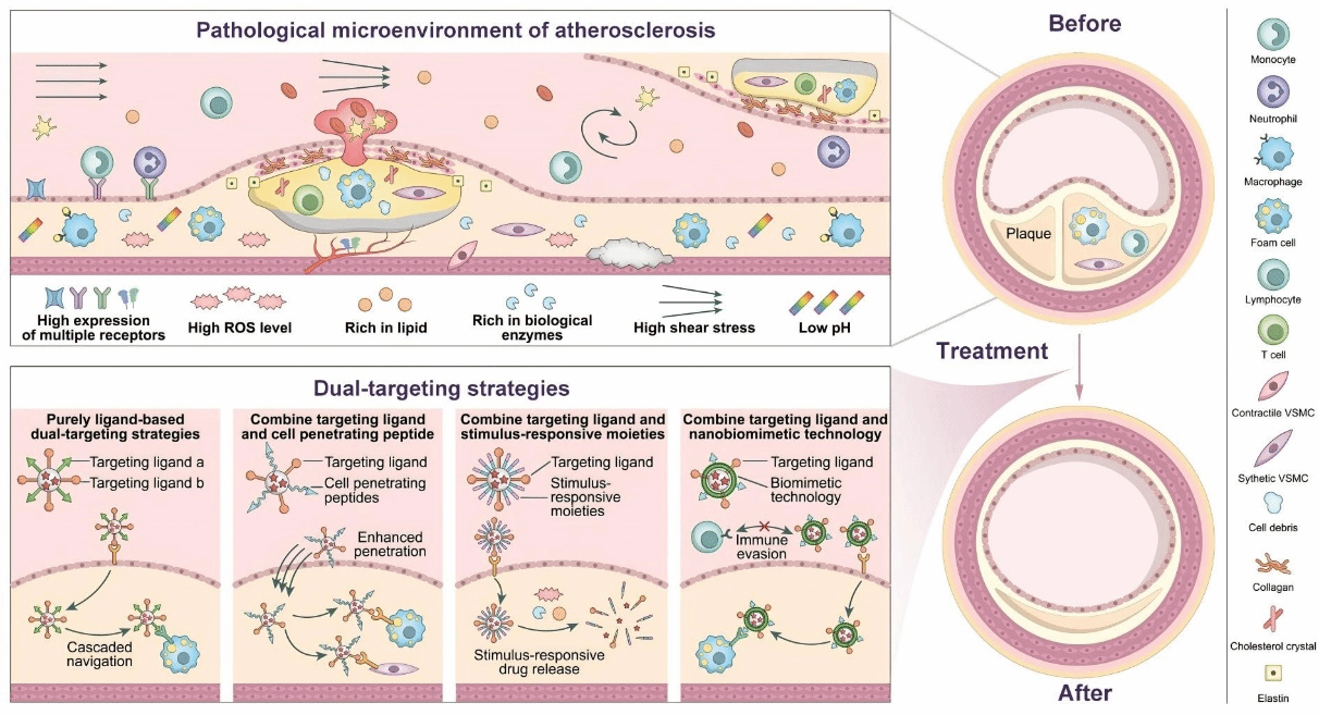双靶向纳米药物递送系统不仅能更精准地将药物递送至病灶部位,还能实现对多个关键病理环节的协同干预,显著提升治疗效果。团队在《Bioactive Materials》(中科院1区Top期刊,影响因子20.3)上发表了题为“Advancements in dual-targeting nanoparticle strategies for enhanced atherosclerosis therapy: Overcoming limitations of single-targeting approaches”的综述,系统阐述了动脉粥样硬化在细胞层面的病理过程,分析了单靶向药物递送系统在应对复杂疾病时的不足。研究基于病理微环境与纳米药物递送系统特征,首次将双靶向药物递送策略系统归纳为纯配体双靶向、配体靶向与细胞穿膜肽结合、配体靶向与刺激响应元件结合以及配体靶向与纳米仿生技术结合四类,并进一步探讨了基于这四类双靶向策略的纳米平台在动脉粥样硬化治疗中所面临的挑战与未来发展方向,为下一代靶向纳米药物的设计提供了新思路。湖北中医药大学2022级硕士研究生杨灿、2023级硕士研究生莫莉青和张桂芝讲师为论文共同第一作者,湖北时珍实验室贺建华副教授和洪怡副教授为论文共同通讯作者。