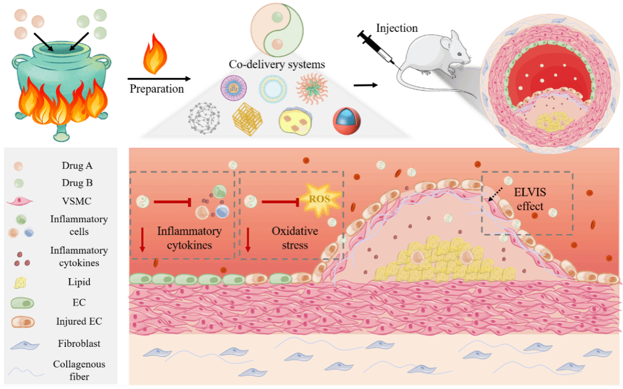 具有联合治疗效应的药物共递送系统靶向治疗动脉粥样硬化示意图